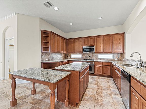 This huge two-story home near all the best things in Katy has an oversized 3 car garage with epoxy floors, a built-in wine rack, walk-in pantry, no carpet, back patio, sprinkler system and a huge backyard. Welcome home to 3315 Tulip Ranch Drive in the sought-after Katy Creek Ranch community! Zoned to Cinco Ranch HS, this stunning two-story home features high ceilings, bay windows, 4 generously sized bedrooms, 3.5 bathrooms and a huge game room. The living area has a corner fireplace and beautiful tile flooring, while the dining room is filled with natural light from bay windows with shutters. The kitchen features granite countertops and coordinating backsplash, rich wood cabinetry, high-end appliances, a spacious island, and custom wine storage. Katy Creek Ranch comes with a neighborhood pool, community center and parks to enjoy. Centrally located near I-10, Westpark Tollway, and the Grand Parkway and just minutes from La Centerra, you have easy access to everywhere you want to be.