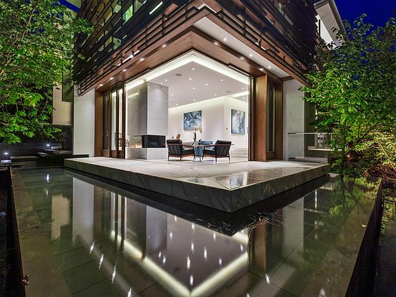 Experience unparalleled luxury in this modern Balinese-inspired villa by G. Wilson, designed by Arno Matis Architecture/RUF Project. A grand foyer welcomes you with soaring 12’ ceilings on both the main level and basement. Exquisite details include custom Italian marble, elegant millwork, and spa-like ensuites. The chef’s kitchen features Miele & Gaggenau appliances, while floor-to-ceiling doors create seamless indoor-outdoor living. The primary suite boasts a lounge area, inner-lit onyx fireplace, and spa-inspired ensuite. A LaScala smart home system integrates lighting, HVAC, audio-visual, and motorized blinds. Outdoor spaces include daybeds, a 48" BBQ, firepits, a hot tub, and stunning water features by Paul S. This is the epitome of luxury living.
