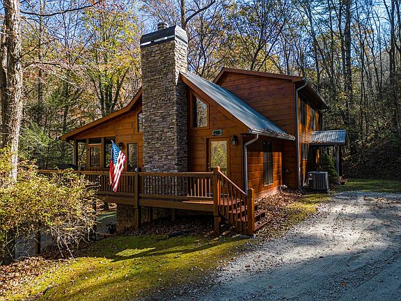 Over the Mountain and through the Woods brings you to this delightful private creek front Mountain Haven. Surrounded by 7 acres of natural wooded beauty full of Rhododendron, Mountain Laurel, Hardwoods, Hemlocks & Holly Trees and 800ft of swift moving rocky creek frontage flowing across the property directly from the mountain above, is this warm inviting Log Sided Cabin Home nestled 400 feet off a county maintained paved road for easy access & just under 5 miles to downtown Blue Ridge and for you enthusiastic hikers, access into the Chattahochee Nat'l Forest hiking trails is a quck 1/2 mile walk away. Completely remodeled in 2004 with other upgrades to date, this charming home offers 3BRs & 3.5BA with the 16X20 Master BR on the main level complete with floor to ceiling windows, a ventless gas log stacked stone FP & master bath with double vanity (Corian counter tops), jetted tub & new tiled shower. The 2nd BR with full bath & a 22 X 8 loft area used as an office and sitting area are located on the upper level & the 3rd BR and a unique stone bathroom and extra living space are located on the lower level along with the one car garage. The 18 X 20 Great room located on the main has space galore & a gas log (or wood burning) stacked stone fireplace. The spacious Kitchen offers lovely cherry cabinets, Corian counter tops, tile floors, large center island, pantry & desk area with more cabinets. The spacious dining room has lots of space for large family gatherings & flows onto the 64ft screened porch overlooking the rocky creek and where the view changes every day from the deer & turkey to the furry bears on occasion. But what never changes is nature's splendor & beauty that surrounds this home every day and the great feeling it will bring when you stretch out on the porch rockers and know you are finally home.