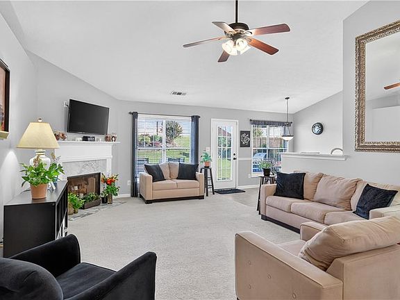 Welcome home to this beautifully maintained 3 bedroom / 2 bath with an open concept layout, vaulted ceilings, and tons of natural light. The gorgeous white kitchen features granite countertops, tile backsplash, stainless steel appliances, and opens directly to the dining area and family room for effortless everyday living. The separate dining room and oversized fireside family room is perfect for entertaining! Split bedroom plan provides ideal privacy. The primary suite offers a generous walk-in closet and spa-like bath with soaking tub, separate shower, and double vanity. Two additional bedrooms share the hall bath. Step outside to your private, fenced backyard oasis with lush, established landscaping, plus an extended outdoor patio—perfect for grilling, gatherings, and quiet mornings with coffee. Newer roof for peace of mind. Beautiful finishes, bright + airy rooms, and a backyard that lives like a retreat—this one checks all the boxes.