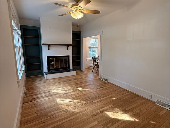 Step inside to a spacious living room featuring original hardwood floors, built-in shelving flanking a fireplace, and plenty of natural light. This space is ideal for entertaining guests, relaxing with family, or enjoying quiet evenings at home. The living room seamlessly connects to the dining area, creating a comfortable and open flow that enhances everyday living.