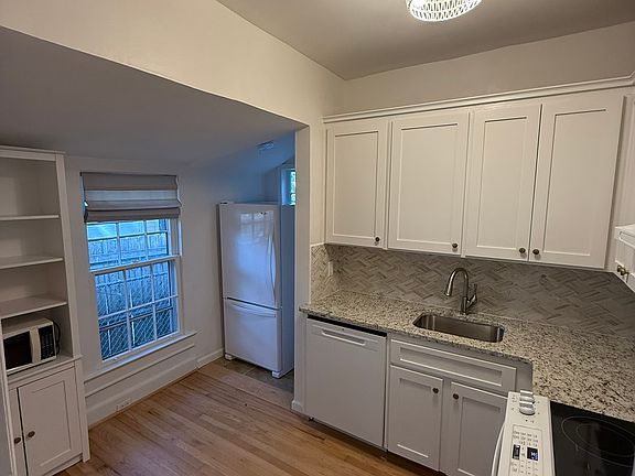 The kitchen has been fully renovated with granite countertops, hardwood floors, and brand-new appliances, including a range, dishwasher, and refrigerator. Ample storage and counter space make cooking and meal prep easy and enjoyable. The dining area connects the kitchen and living room, perfect for casual meals or hosting dinner with friends.