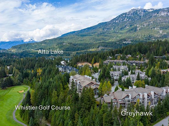 Ideally positioned within the desirable Blueberry Hill neighborhood, presents an exceptional location with convenient access to Whistler Village via the picturesque Valley Trail. The property boasts stunning views of Blackcomb Mountain and the golf course. This one level end unit, encompassing two spacious bedrooms, and two well-appointed bathrooms. The thoughtfully designed floor plan fosters an open and airy ambiance, creating an inviting atmosphere suitable for both relaxation and entertaining. The property permits nightly rentals, offering an excellent investment opportunity or a personal year-round retreat. Greyhawk amenities include secured underground parking, a communal hot tub, and a private storage locker. NO GST
