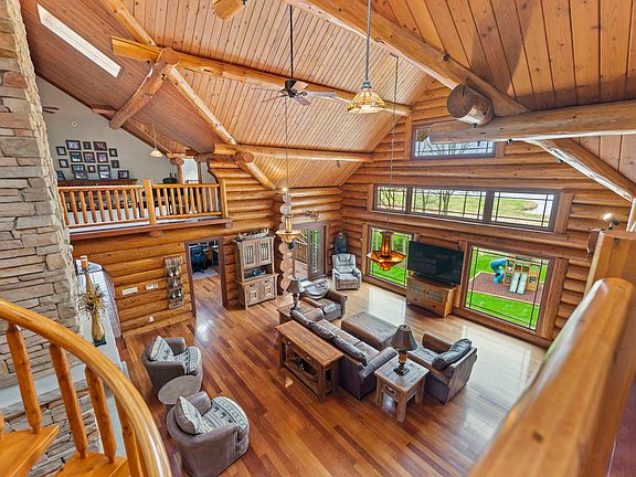 Handcrafted full log home secluded on 5 acres. The 2 story Great Room has floor to ceiling masonry fireplace and great open views. The high end kitchen has newer built-in appliances, granite counters, island with stools and a walk-in pantry. There are 2 bedroom suites, one on the main floor and one upstairs. The theater room includes equipment and recliners. The large loft space overlooks the Great Room. The finished walkout basement has a recroom with bar, indoor pool and full bath. Enjoy the gorgeous lake view from the expansive deck. Incredible landscaping includes a waterfall. There are 2 large outbuildings with electric and concrete floors. One of the buildings is heated. These are good for car collection, shop, storing your boat and toys. The home has a Woodstock address and is in the Crystal Lake school district. You will feel like you are in the Northwoods but it is 10 minutes to Metra trains, 1 hour to O'Hare and Chicago.