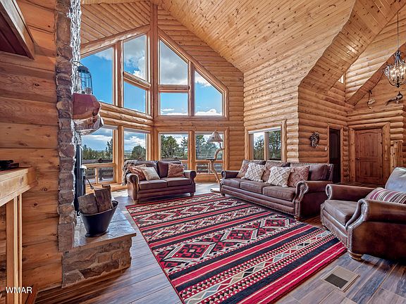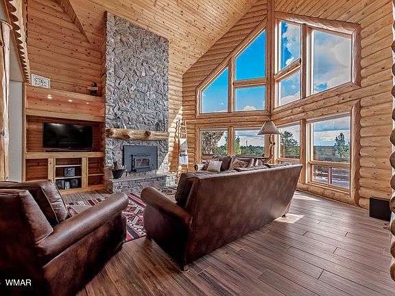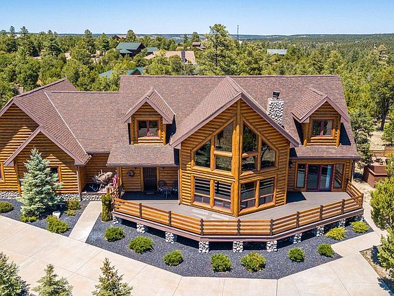 Gorgeous log sided home located in Heber on the Mollogon Rim. A large front deck with amazing views overlooks the Rim. An oversized, side entry 3-car garage with epoxy floors, attached cabinets and T&G on the walls answers all your storage needs. The rear deck has composite flooring and recessed lighting with dimmers. Steps away is an outdoor kitchen with a gas BBQ, pizza oven, storage, and granite countertops. The adjacent gas firepit is a bonus. This entertainment space is perfect for food, family, friends, and great conversation. The laundry room has a sink, storage, and direct entry from the garage. The eat-in kitchen has abundant cabinets, granite countertops, breakfast bar, S/S appliances, pendent lighting, and a walk-in pantry. The primary bedroom is on the first floor with a stone gas fireplace and access to the front deck. The updated bathroom has tiled floors, a separate bath and tiled shower, along with split vanities and a private water closet. Two large bedrooms, one with a lock-off bathroom are upstairs on either side of an open loft. The loft offers spectacular views out a wall of windows and is the perfect space for a game room, media room or a comfortable reading alcove. There is a large unfinished space above the garage and accessible through an upstairs bedroom.