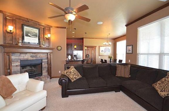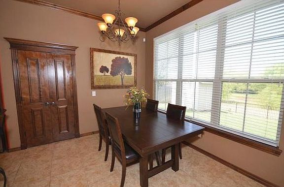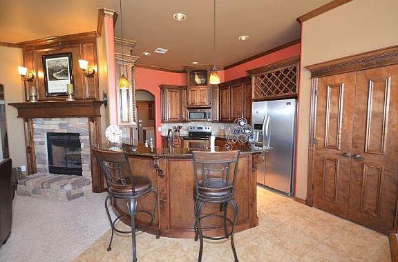 This beautiful home sits right on the pond and features elegant details throughout. The covered patio with fireplace, outdoor sound systems and pond views will lure you home daily and the details in the woodwork, tile, granite and the views are sure to impress. Vaulted ceilings and accent lighting in the master, as well as a full walk in closet with built-ins and a window make this home feel custom. This home's has warm neutral colors.