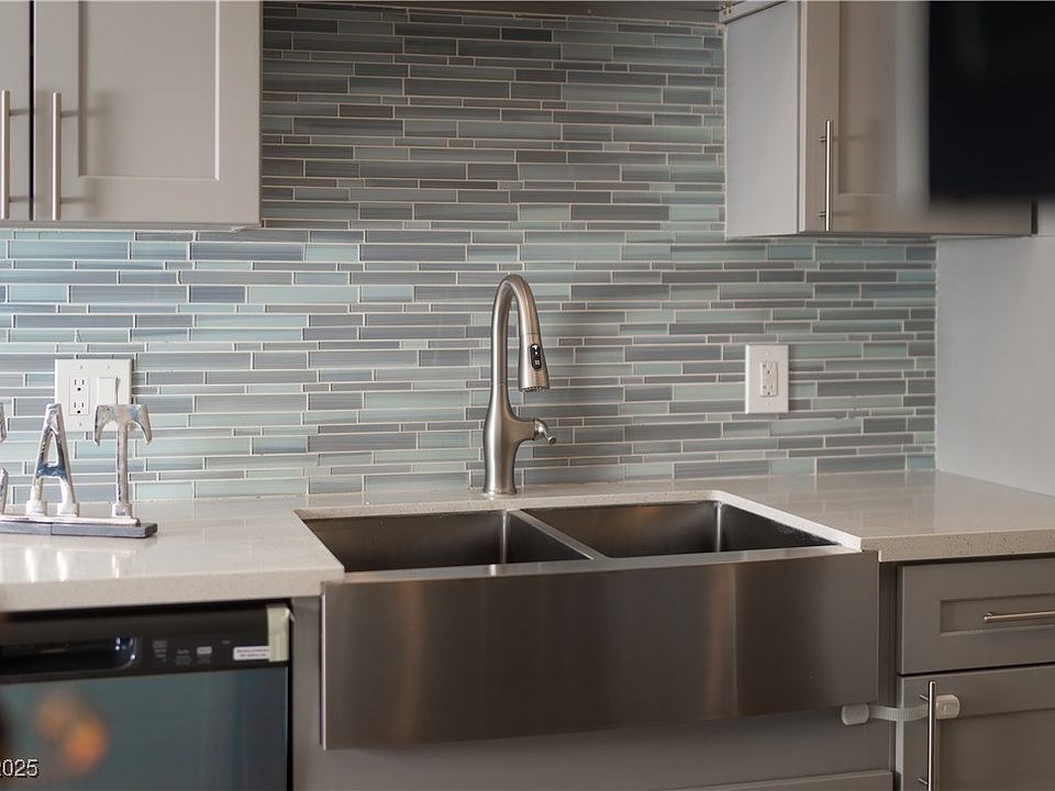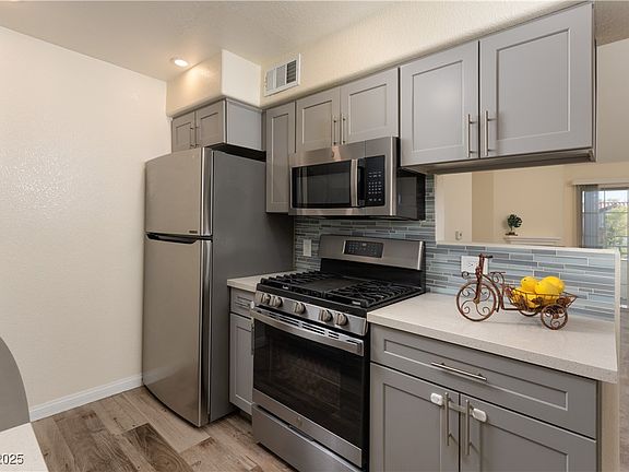 Step into a modern, bright, and expertly redesigned 2-bedroom, 2-bath Las Vegas condo with intention and style, ready for immediate occupancy. Enjoy a spacious open layout with wide-plank floors, modern countertops, custom backsplash, and stainless steel appliances that make every detail feel elevated. Natural light floods the space, while the cozy fireplace, upgraded bathrooms, and in-unit laundry add daily comfort and convenience. Step outside to your private balcony with views — it's a perfect extension of your indoor lifestyle. Located in a gated resort-style community with pool, spa, clubhouse, and park-like grounds. Minutes from shopping, dining, and freeway access. Whether you're looking for a stylish personal home or an investment, this one delivers!