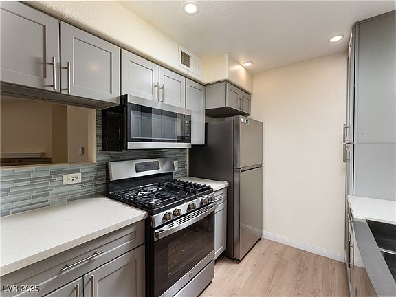 Step into this impeccably redesigned 2-bedroom, 2-bath Las Vegas residence, where modern elegance meets refined comfort. Reimagined with sleek, wide-plank flooring, designer countertops, custom tilework, and premium stainless steel appliances, every finish is intentional and tastefully curated. The open-concept layout flows effortlessly around a statement fireplace, creating a warm and inviting space that is perfect for both relaxation and entertaining. A well-designed floor plan offers seamless flow between spaces, enhanced by a private balcony that extends the living area outdoors. Thoughtful upgrades continue in the stylish bathrooms and full-size in-unit laundry. Nestled within a resort-style community with pool, spa, and clubhouse amenities, this condo is ready for immediate occupancy and ideal for a personal retreat residence or investment property.