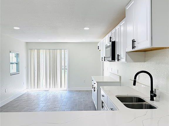 Newly updated kitchenSleek countertopsModern open layoutWood-look tile flooringRecessed lightingNew cabinetsStylish vanities