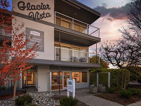 Among these charming communities is Glacier Vista, a 55+ neighborhood of 24 warm and welcoming apartment homes. Residents here enjoy a friendly atmosphere and thoughtfully designed living spaces. Each apartment features spacious floor plans, generous kitchen storage, dishwashers, and private balconies with breathtaking views of the Cascade and Olympic Mountains. Additional amenities include controlled-access entry with an elevator, covered garage parking, and laundry and storage rooms on every floor.