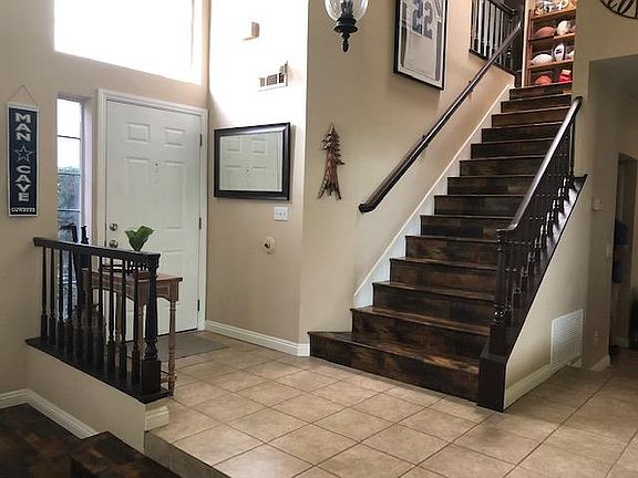 Extensively upgraded West Ranch home with a fantastic large private backyard. Tile entry leads to step down living room and dining room with high windows for extra light. Beautifully upgraded flooring, new lighting, new appliances, updated kitchen and bathrooms, new energy efficient windows with shutters, updated central refrigerated AC PLUS central evaporate AC (LOW cooling costs). So many upgrades and features, nearly impossible to list all of them. All bedrooms are upstairs and have new carpet. Spacious master suite with separate stall shower and soaking tub, walk in closet with organizers, dual sinks in upgraded vanity AND has a huge balcony made with Treks (wood substitute that needs no maintenance). Located at the end of a cul-de-sac with a drive-thru garage, big gated RV access with a basketball hoop. Lots of shade trees and lawn areas, large covered patio, gated kids play yard, & extra storage. All this near great westside schools and shopping. Won't last long at this price