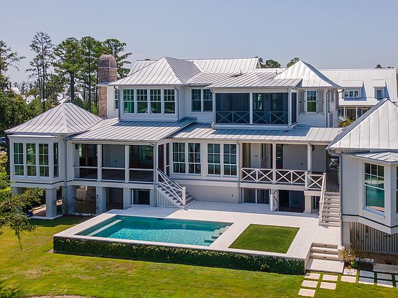 Welcome to 332 Bayley Road, a rare and breathtaking estate in the coveted Captain's Island enclave of Daniel Island Park. Perched along the edge of Ralston Creek, this home is a landmark the moment you cross the Captain's Island bridge. Designed by renowned architect Beau Clowney and built by Rob Crawford's Renaissance South team, every inch of this 5-bedroom, 5-bath home showcases the highest caliber of Southern elegance and modern comfort. With magazine-worthy architectural detailing, a detached guest/pool house, playful bunk room, private office, and striking marsh views, the home redefines Lowcountry luxury. Enjoy multiple porches, a serene pool, private deepwater dock, and refined outdoor living spaces that rival the interiors. This is your chance to own a legacy property thatblends timeless design with unmatched waterfront living. As you approach, the home reveals itself slowly rooflines carved with architectural intention, mahogany accents gleaming beneath the Lowcountry sun, and lush landscaping that frames the estate with quiet elegance. The brick paver driveway, with its custom inlaid medallion, leads you past flickering gas lanterns that nod to Charleston's timeless charm. Stepping inside, you're welcomed by wide white oak floors and a layout that unfolds with deliberate grace each space offering a glimpse of the water beyond. To your right, a formal sitting room invites calm conversation; to your left, a grand dining room shimmers under twin chandeliers. As you continue down the entry hall, the home opens to its heart: a sunlit living room and an impeccably outfitted kitchen, where form meets function in every detail. The formal office, tucked at the rear, feels like a study suspended above the creek its vaulted walnut ceiling, locally sourced and rich with warmth, envelops the room in quiet sophistication. In the kitchen, paneled luxury appliances, two dishwashers, and anti-bacterial ceramic countertops create a workspace fit for a chef, while a charming breakfast nook, framed by expansive windows, offers front-row seats to nightly sunsets. A mirrored wet bar gleams nearby ideal for entertaining while a discreet butler's pantry hides an additional laundry setup, perfect for handling pool towels or entertaining prep with ease. Step outside to a resort-worthy retreat where a quartz-finished pool sparkles in the sun. Heated, chilled, and covered at the touch of a button, it's built for year-round enjoyment. Lounge on turf with panoramic creek views as your backdrop, or stroll to the deepwater dock crafted from Trex composite for barefoot comfort, and outfitted with cable railings, a fish-cleaning station, shower, and WiFi. The jet dock handles up to 18,000 lbs, ready to host your 30+ foot vessel. Beneath the home, shaded loggias offer cool respite and the perfect space for evening cocktails or a lively game of ping pong, all surrounded by blooming jasmine and heirloom roses. Adjacent to the kitchen, a versatile hobby room invites creativity ideal as an art studio, playroom, or quiet second office. Nearby, the custom bunk room adds a playful touch, with shiplap walls, built-in bunks, and trundle beds designed to host sleepovers and memory-making. A full bath just steps away ensures comfort for all. Ascend by elevator or grand staircase to the owner's suite a tranquil sanctuary with sweeping water views and the gentle rise of morning light. Remote-controlled shades, dual custom closets, and a spa-like en suite bath complete the experience. A curbless glass shower and a soaking tub, centered atop a mosaic tile "rug," elevate daily rituals. Just beyond, a private balcony beckons your personal lookout over the creek, perfect for sunrise meditation or evening reflection. Beyond the owner's retreat, a generous landing transitions to two well-appointed guest suites, each with its own en suite bath and serene design. The laundry room, as elegant as it is functional, features custom cabinetry, a designer sink, and hand-selected wallpaper a reminder that no detail was overlooked. Steps from the main home, the guest/pool house offers a private escape for visitors. Complete with a living room, kitchenette, and full bath, this charming suite is equally suited to short stays or extended visits. The bedroom crowned by a rare "bird's mouth" design boasts breathtaking 180° views of the creek, making it one of the most enchanting spaces on the property. Captain's Island is an exclusive enclave set on a 90-acre private island, accessible by bridge from Daniel Island Park. This thoughtfully planned community features shared docks, scenic trails, parks, ponds, and preserved natural areas. Architecture is guided by neighborhood-specific design standards that emphasize a relaxed, refined coastal aesthetic. The development includes dedicated amenities reserved solely for Captain's Island residents. This is a rare opportunity to purchase a deepwater home that was drawn, built, and maintained to perfection. Do not miss the chance to call it yours!