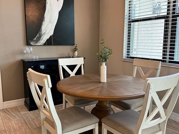 A king bed and 55" T.V. are offered in the master suite, along with a sitting area and a private door to the pool. This suite includes his and her closets, a huge master bathroom with water closet and tile walk in shower. The split floor plan places two spare bedrooms on the other side of the home. The second bedroom offers its own pool access with a king size bed. The third bedroom is furnished with a bunk (twin top, full bottom). A hall bath with a combination tub and shower is shared by the two guest bedrooms.