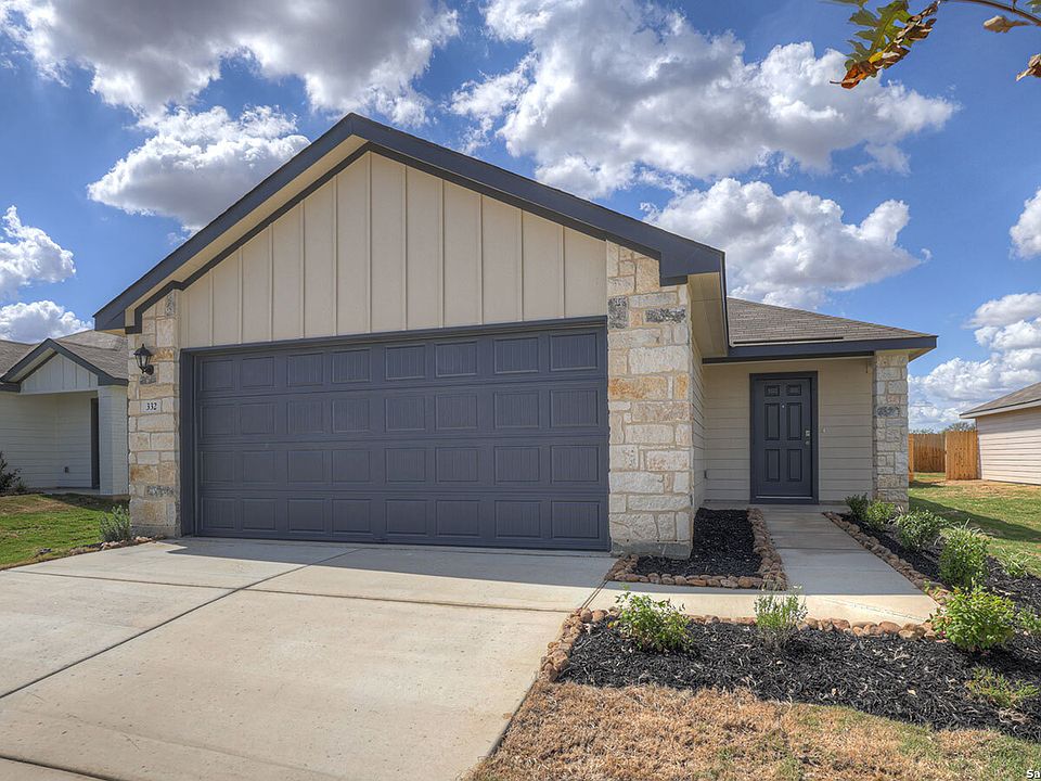 MOVE IN READY! Check out the Barton, one of our one-story floorplans available at Arroyo Ranch in Seguin, Texas. This 3 bedroom, 2 bathroom home includes a 2-car garage all within 1,280 square feet of comfortable living space. Our homes in Arroyo Ranch feature brick and stone exteriors and the Barton is available in 2 exterior options. As you enter the home from the front porch, you'll be in the foyer, which includes the utility room and hall closet. Moving further into the home, you'll find the kitchen, dining and family room. Built as an open concept living space, you're sure to make many memories here. The kitchen features an island with a stainless-steel sink, quartz countertops, 42" upper 'picture frame' cabinets, a pantry closet, and stainless-steel appliances. The secondary bedrooms and bathroom are located off the kitchen. The bedrooms include carpet and closets with wood shelving. The secondary bathroom has a shower/tub combination and a cultured marble vanity with trench sink. The primary bedroom is tucked away at the back of the home and includes an attached bathroom. Start your mornings off right in this private space, which includes a walk-in shower, cultured marble vanity with trench sink and a walk-in closet. This home features our America's Smart Home base package, which includes the Amazon Echo Pop, Video Doorbell, Front Door Key Code Deadbolt Lock, Home Hub, Thermostat, and Deako Smart Switches.