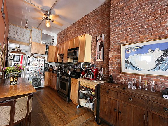 Walk up just one flight to this light-flooded, spacious sanctuary, featuring exposed brick walls and 12-foot ceilings. This large 1-bedroom floor-through gem has a well laid out chef's kitchen with an adjacent dining room. The kitchen has plenty of granite counter space, stainless steel appliances, an industrial style backsplash, an over-the-counter microwave oven, and a dishwasher. The living room, with two oversized windows and a towering ceiling with a fan, is a sight to behold - and perfect for entertaining.