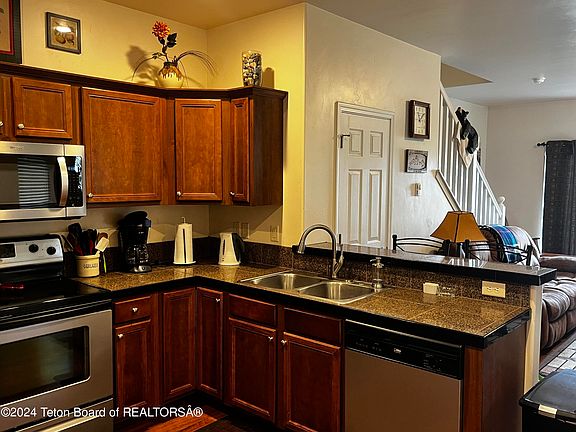 Location, Location! Sought after three bedroom, two and 1/2 bath Rendezvous Townhome. Walk to downtown Driggs. Main bedroom with ensuite bathroom and walk-in closet. All bedrooms with celing fans. Individual thermostates in all rooms including bathrooms. Home is fully furnished including linens, small appliances and utensils. One car oversized garage with room for all of your toys including overhead bike lifts/hangers. Easy access to Grand Targhee either by car or shuttle from Driggs. Beautiful landscaped walking trails within Creekside Meadows and access to community bike paths. Exterior maintence, insurance, snow plowing, and landscaping included in low HOA fees allow for easy living. Thirty day minimum for rentals. Enjoy all seasonal activities from this well located townhouse