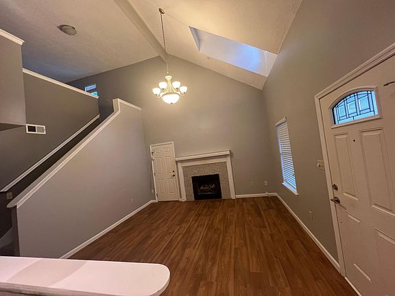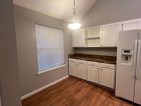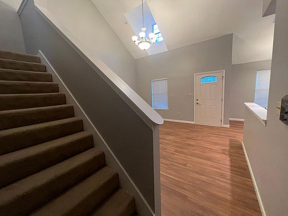 Open floor plan. Kitchen, breakfast area, and living room, are all open with vaulted ceilings. The master bedroom upstairs looks over the living room and is a loft area. The master bedroom has two separate spacious walk in closets. Brand new floors, and kitchen and bathroom counter tops, and microwave. Two bedrooms downstairs with a shared bathroom. There is a storage shed in the backyard. Fenced in back yard and carport for one car and enough room for another car in the driveway. Renter pays all utilities. Responsible for the yard. Will need to pay a non refundable pet fee of $450