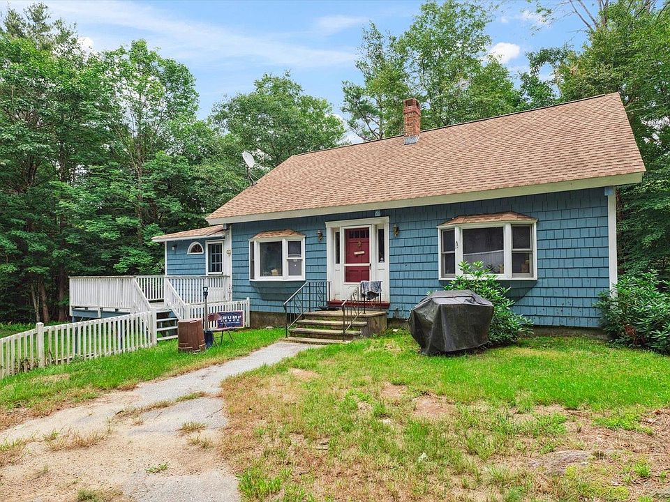 This Cape Cod home is located in a private and convenient Jaffrey area with rural appeal, yet close to business, shopping, Mt. Monadnock and local amenities. It sits on 6+ acres of privacy and room to grow. There are two outbuildings for hobbies or business needs, offering a heated and powered workshop with good ceiling height (formerly used for auto repair). Plenty of room for the car and bike enthusiast with an additional three-bay-garage. This home has pine tongue and groove and beamed ceilings. A spacious kitchen/dining room, living room, family room and three bedrooms.