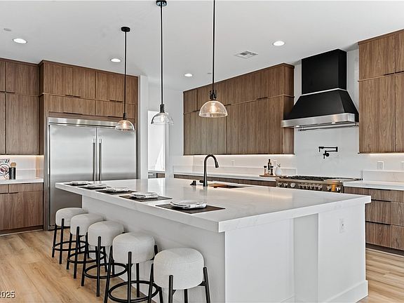 Contour Persona is an enclave of Executive-Style homes nestled in the Foothills of Henderson where clear site lines to the Las Vegas Strip are prevalent. Neighbors include Heritage Park, the Aquatic Center, the Senior Facility, and the nearby amenities of the Water Street District. This two-story new home offers mountain and strip views, 5035sf, 5 ensuite bedrooms w/ walk-in closets, 4-car garage parking, RV parking + hook-ups, tall ceilings, massive laundry w/ island, Super Loft at deck, soft-close cabinets, quartz slab counters, luxury flooring finishes, matte black fixtures, wet bars, linear fireplace, oversized patio/deck, and a pool-sized yard. Kitchen includes nook and butler area with walk-in Pantry and space for additional fridge, Bertazzoni Master Series stainless appliances including 48" range/oven with hood, refrigerator + freezer columns, 2 dishwashers, microwave, and warming oven. Primary Bedroom has an oversized walk-in closet w/ laundry, wet bar and a spa-like bathroom.