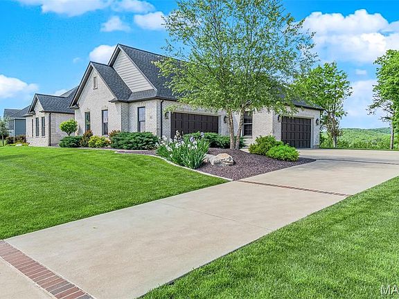 Welcome to luxury living in the highly sought-after, gated golf course community at Pevely Farms! This stunning home offers lake views, a new roof (Oct ’24), and full brick/stone exterior with James Hardie siding. A brick ribbon driveway leads to a 4-car extended finished garage w/ 9’ doors. Enjoy beautifully landscaped outdoor living w/ multiple seating areas, including a brick-paved fire pit area. Inside, the open floor plan features LVP flooring, 8’ doors, 7” baseboards, and great room w/ 12’ ceilings, custom window treatments, and a dry-stack fireplace w/ custom built-ins. The gourmet kitchen boasts a marble island, quartz counters, Sub Zero fridge, JennAir appliances, wine fridge, and large walk-in pantry. The primary suite includes custom window treatments, custom closet system and a luxurious bath w/ soaking tub. The finished lower level is perfect for entertaining w/ a theatre room, wet bar, pool table, spacious guest bedroom, and walk-in shower. This home is a true DREAM HOME!