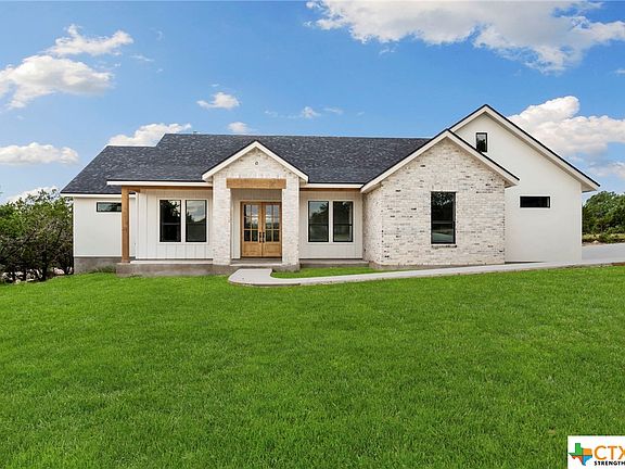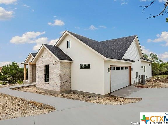 Fabulous new construction in the prestigious community of Mystic Shores on the North side of Canyon Lake. This modern hill country home has beautiful unique finishes, high ceilings, open floor plan, & stained concrete floors. Wood slat accent walls, wood beams, headers and wood doors are a few of the features along with wood burning fireplace, quartz countertops, hand made Zillige tile backsplash, farm house sink and propane cooktop. This 1 story home has a beautiful master with vaulted ceiling, wood beam, large windows and elegant master bath with separate shower, soaking tub, & large master closet with built-in shelving. Also included is a separate office/study and butler's panty. This home is on a beautiful 1 acre lot, has majestic mature oak trees in the back, a beautiful covered patio with propane connection and is located on a quiet street. Mystic Shores amenities include 2 pools, lakeside park, sports courts, boat ramp, storage, and nature preserve. This house is a must see!