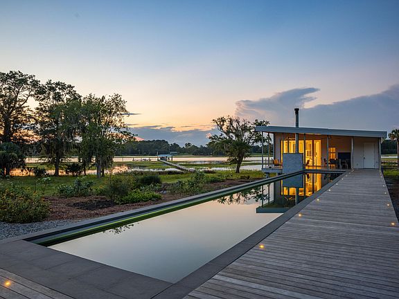 This is one of the most unique properties you will find in Charleston. Welcome to this modern, private, gated deep water estate on Bohicket Creek, which consists of a main house, guest house, and workshop/garage. This is a custom-designed Ecosteel home constructed with recycled 6'' steel stud framing, all-weather insulated panels, concrete, and impact Fleetwood windows and doors. 70% of the home is floor to ceiling glass to fully take advantage of the remarkable marsh and water views. This property is self-sustainable with solar power for all dwellings with 65 photovoltaic solar panels, Preston Howard shallow well water system with whole-house Pentair filtration system, 30KW Cummins whole house generator, self-sustainable English-inspired garden with all plants grown from non-GMO heirloomseeds, removable fencing for livestock, 2 chicken coops for up to 150 chickens, and greenhouse. This property is eco-friendly, hurricane proof up to 150mph, as well as fire, flood, and termite resistant. The dock was fully re-decked in 2019 with marine-grade materials for the 5 ft walkway and floater. There is a covered pierhead, 16,000 lb boat lift, 40 ft floater with additional mooring piling to accommodate boats of 65+ ft, and 14 feet at low tide. Along with stunning gardens, deep water dock, and views, this property has a 25 meter elevated pool with IPE decking, lutron LED lighting installed in the decking, automatic pool cover, and plenty of room for lounge chairs and outdoor dining. The entrance to the main house has a covered deck with polished concrete floors, wood-burning fireplace overlooking the pool and view, and a stunning 15 foot accordion-style glass Euro door leading into the main house. Open this Euro door and let the interior and exterior flow together. With the majority of the walls being glass, you truly see a view unlike any other. The entire house is very open and naturally bright. The kitchen has a 17 foot island with white quartz waterfall countertops, bar stool seating for many guests, stainless steel sink, Wolf gas cooktop with stainless steel hood, Thermador double wall ovens, Thermador refrigerator, and tons of hidden storage. The entire interior is perfectly designed with efficiency and simplicity in mind. The custom cabinetry was done by renowned Shannon Horning throughout the homes. The kitchen and living areas have all white high gloss cabinetry to reflect not only the light, but the views. The houses are equipped with Lutron LED lighting and custom motorized Lutron shades for privacy. There are 4 bedrooms in the main home and all have custom built-in furniture and birch cabinetry. The master bedroom has its own porch with private outdoor shower, Rain shower, dual vanity sinks, all with Hans Groh fixtures, and Duravit sinks and commodes. All three guest bedrooms have the same built-in furniture and storage made of birch cabinetry by Shannon Horning. Two of the bedrooms have a jack and jill bathroom. All bathrooms have Duravit and Hans Groh fixtures. There is a half bath located at the entrance to the home for guests. There is a laundry room with excellent storage space, front loader washer and dryer, and a large pantry with wine refrigerator. There is a tankless Rinnai water heater and HVAC with whole house dehumidifier. The guest house is across from the main house with access to the pool and pool deck. There is an outdoor shower located on the side of the guest home with IPE and concrete stall, perfect for post-dock or pool showers. The guest house has a living area, kitchen with Subzero refrigerator, white quartz countertops, bedroom with custom built-in murphy bed, full bath, stainless Minka fans, and private covered deck overlooking the view. The guest house is also mostly glass floor to ceiling walls with stunning views. There is a 900 sq ft workshop/garage with hurricane proof garage doors and heavy-duty shelving for storage. The driveway consists of recycled concrete gravel and a 14 foot acoustic privacy berm was built at the entrance of the property. The property is gated with security cameras. This property was impeccably designed and is a must to see in person. If you aren't into sustainable gardening, a landscape plan surrounding this property would be incredible as well. SEE ATTACHED VIDEO, VIRTUAL TOUR, AND FLOOR PLAN!!!