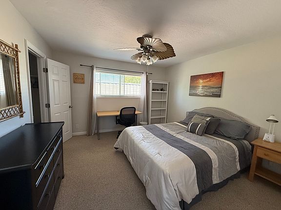 The bedroom to the left of the stairs is the second bedroom which also has a huge walk in closet, Queen bed with all bedding, sit/stand desk and comfy computer chair, dresser, nightstand with reading light and charging station, and bookshelf. This room looks out to the front of the house and has a gentle breeze that blows with lots of natural sunlight.