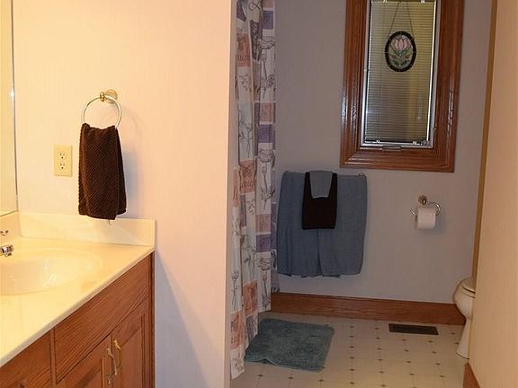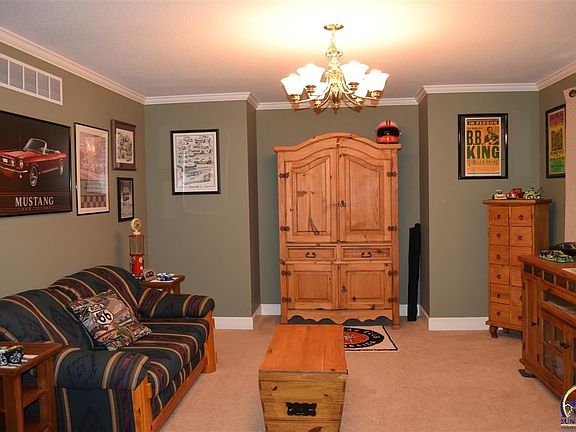 Wooded 1 acre near Lake Shawnee golf course and walking trails. Great rm w/ 10ft ceiling, fireplace & bookshelves. Spacious home with large foyer, oak floors and crown molding. Large kitchen island & lots of pull-outs & eating area. Formal DR is being used as den. Newer interior paint. Neat stone single garage/shop. Basement has family room, bedroom and full updated bath.