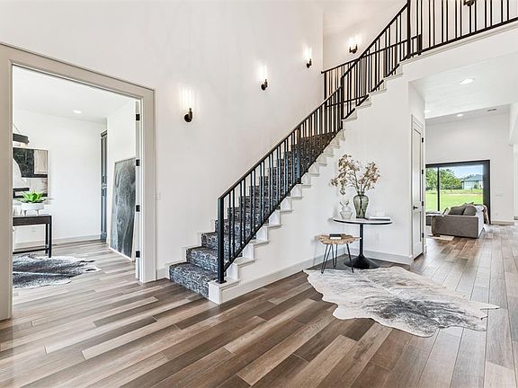 Enter through the impressive Monte Cristo steel door into a dramatic 20-foot foyer, where a statement chandelier, iron handrails, and sconce lighting set the tone for sophistication.