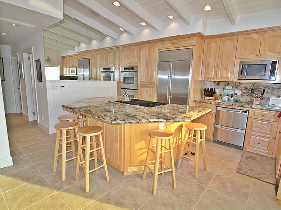 Let the island and sunset views take your breath away when you stay at this oceanfront dream house! This amazing home features decks on either side of the house, perfect for soaking up the sun any time of day! Enter the home to the open-concept living and kitchen area, bright from the natural light that pours through the beachfront windows. In the living room you'll see a wood-burning fireplace for those chilly nights, as well as a TV for entertainment. Sofa pulls conveniently pulls out to a bed, providing an extra sleeping space. Gather around the island bar in the kitchen, complete with granite counter tops. Down the hall you'll find a full bath, nautical-themed bedroom with 2 twin beds, and another bedroom with king bed and attached bathroom. Upstairs is the master suite with attached bathroom, bar area, access to decks on both sides of the house and 180 degrees of ocean views! Available to rent furnished or unfurnished