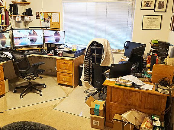 Continuing further down the corridor to your left is a 12'-6' x 12'-6" office. This office enjoys a double sliding door closet, a large sliding glass window which faces the front, and an oak desk. (The office is presently shared, however modifications are being made to rearrange into your personal office or a second bedroom.)