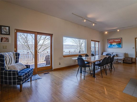 Beautiful contemporary home outside of the village of Watkins Glen with sweeping views of Seneca Lake! This large 3 bedroom, 3 full bathroom home resides on a wooded lot with incredible privacy, overlooking the lake. While being tucked in the trees, enjoy the quiet while not being far from town with public utilities! The layout has unique spaces for entertaining with large kitchen flowing to dining area situated to the outside deck, with huge picture window. The space offers flexibility, now currently with two living rooms. Two exterior deck options (one facing Seneca Lake, one nestled in trees in back) extend your living space. A large first floor master with attached modern bathroom with walk in shower & soaker tub, and large closet. Another large bedroom, full bath, formal foyer and laundry room complete the first floor. The lower level has third bedroom with en suite full bath. Level first floor living with parking area on top or use deep 2 car garage with workshop below all accessed via freshly paved driveway. This is one to see for yourself! Open House options include both Thursday April 4: 5-6pm + Saturday April 6: 1-3pm. Delayed negotiations until April 9th @ 12pm.