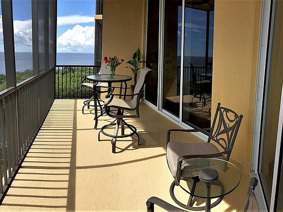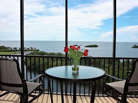 Enjoy SPECTACULAR BAY VIEWS in the day and AMAZING SUNSETS in the evenings right from your own den or on your screened-in balcony. This TURNKEY 6th floor, 3 bed / 3 bath condo features an open great room layout with an additional den/wedge area and HIGH CEILINGS only available in the 6th & 7th floor units. The modern kitchen has granite countertops, tall cabinets w/pantry, cooktop, convection oven, and comfortable bar stools at the bar. The master suite includes an oversize walk-in closet...and has the same AMAZING BAY VIEWS through it's large window & slider going out to the balcony. The master bath is spacious with dual sinks, large walk-in shower, and separate tub. Additional features include a wet bar and mini-refrigerator, laundry room w/ sink and cabinets, Tommy Bahama furniture, tile & carpet throughout, and large impact-resistant sliding doors & windows. The unit includes 2 underbuilding parking spaces and a storage unit. Amenities include an amazing clubhouse, pool/spa, movie theater, fitness ctr, sauna/steam rooms, marina, restaurants, golf, tennis, and more (some have add'l fees).