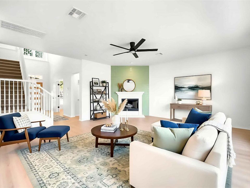 Striking fireplacePrivate backyardUpdated lightingFlexible bonus spaceWaterfall-edge quartz countertopsSpacious dining areaFresh designer paint