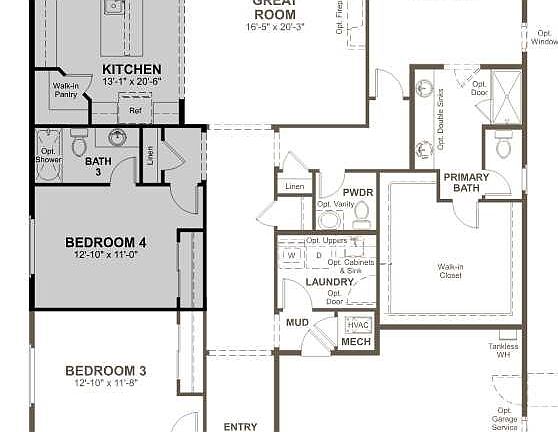 The ranch-style Cassandra plan showcases an open, inviting layout featuring a great room, a dining nook and a large kitchen with a center island and walk-in pantry. An elegant primary suite boasts a private bath and a generous walk-in closet, and two secondary bedrooms invite rest and relaxation. Other highlights include a second full bath, a convenient laundry and a covered patio. This home may be built with a study, a formal dining room with butler's pantry or an additional bedroom and bathroom. You'll love the designer details.