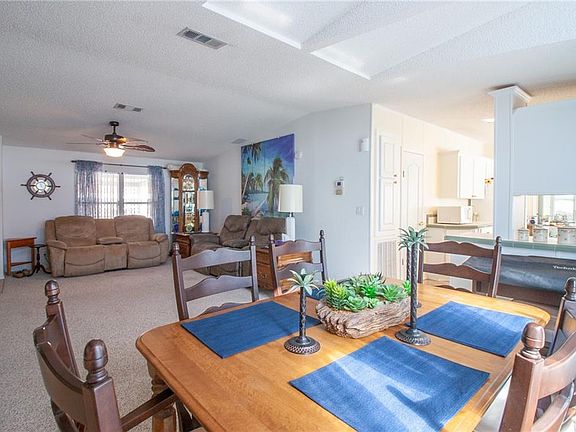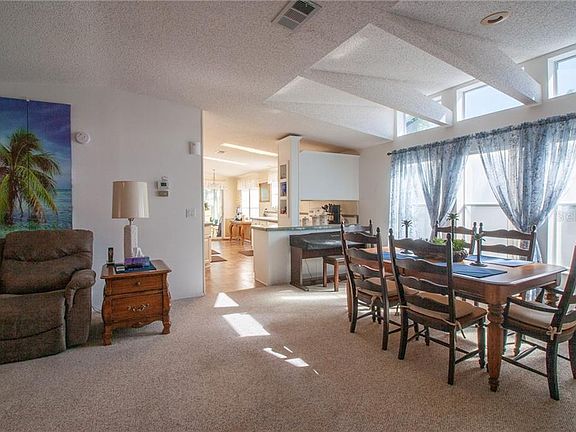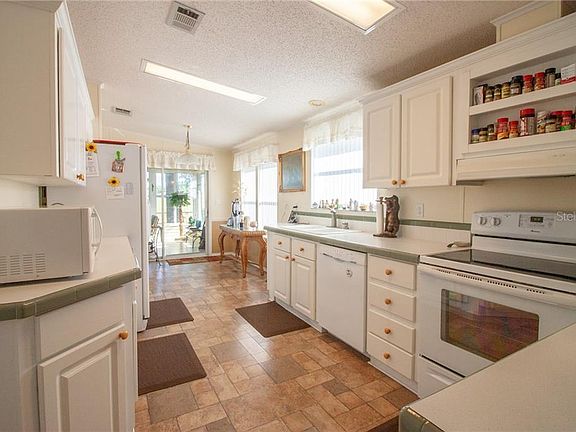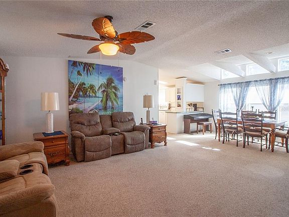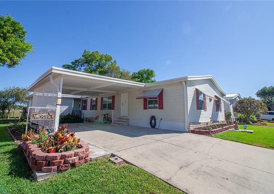 This charming, well maintained Manufactured Home is in an active 55+ community with a low HOA of only $60.00/monthly and access to the Harris Chain of Lakes! The large Living/Dining Room combination leads to the Kitchen with ample cabinet space and a Dinette Area. Nice size Master Bedroom with a spacious adjoining Bathroom. The over sized 3rd Room would make a great Den or Office. Enjoy the outdoors in the Florida Room overlooking a pasture! Besides the Double Driveway with a Carport, the back yard has a Chain Link Fence and a Workshop with a Cement Pad for grilling. There is so much natural sunlight throughout the home along with some updates. The Laundry is conveniently located inside the MH off the kitchen. Heat Pump installed 2020, luxury vinyl planking, new windows 2023 New kitchen with granite countertops and new stainless appliances in 2023 Please note: Lake County Records shows 3 Bedrooms (one without a closet). The Palm Tree art work in the living room and entire outside Garden set-up do not convey. Buyer's agent must verify all measurements. All information provided in this report is believed true and accurate at data entry but not guaranteed.