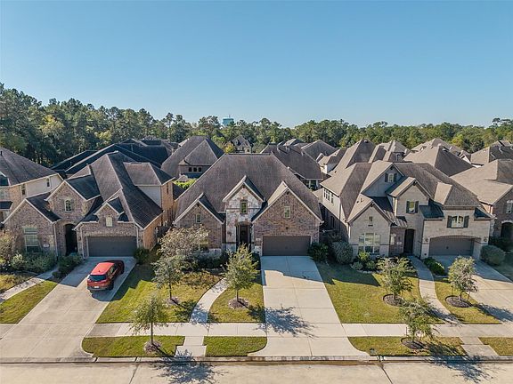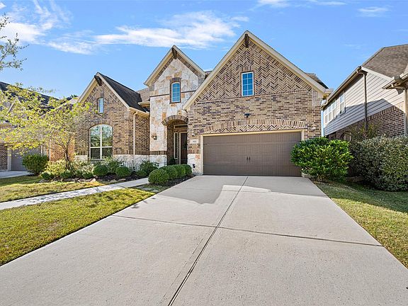 Upgraded Village Builders home in Royal Brook filled with natural light and a flexible floor plan. Brick and stone elevation opens to a stunning entry with coffered ceiling and a two-story family room featuring a soaring 20' ceiling, surround sound, and fireplace. Rare layout with primary plus two secondary bedrooms down. The first-floor study offers glass French doors and the laundry room has space for a second fridge. The island kitchen opens to the family room and includes granite countertops, stainless appliances and a walk-in pantry. The spacious primary suite features an 11' coffered ceiling, garden tub, 2 walk-in closets with built-ins, and a double granite vanity. Upstairs offers a game room with walk-in closet and a media room or 4th bedroom wired for sound, complete with Murphy bed and custom built-ins. Backyard includes a covered patio wired for sound, sprinkler system, and Tree Frogs playset. Attached garage with epoxy flooring and extra shelving. Zoned to Kingwood schools!