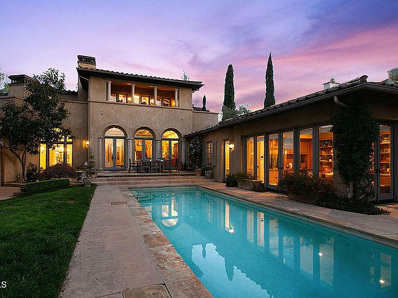 Exquisite One-of-a-Kind Gated Estate nestled in the prestigious and gated community of Bella Vista Estates, breathtaking custom Tuscan villa is a masterpiece of design & craftsmanship. Conceived by acclaimed architect Adriene Coulter, the residence artfully blends modern sophistication w/the timeless elegance of the Italian countryside. Positioned on a quiet cul-de-sac, this remarkable estate offers nearly 6,000 square feet of luxurious living space on almost 2 acres, sweeping panoramic views of the Topa Topa Mountains & fairways of Los Posas Country Club. Every inch of this home speaks to thoughtful architecture and extraordinary detail. Plaster walls, elegant arches, dramatic step-down rooms, & soaring coffered/beamed ceilings lend dimension & character throughout. Grand circular driveway sets the stage, leading to a home distinguished by imported wide-plank wood flooring, hand-carved wood doors, custom chandeliers, & rustic stone fireplaces that evoke old-world charm.Gourmet kitchen is a true culinary sanctuary--designed to impress & function.Highlights inc dual center islands, a Sub-Zero refrigerator & fridge drawers, high-end stainless steel appliances, a walk-in pantry, & a dedicated pasta sink w/a pot-filling arm.The kitchen opens seamlessly to the expansive family room, where French doors reveal a covered veranda with breathtaking vistas, ideal for both intimate moments and grand-scale entertaining.Luxurious primary suite offers a serene retreat, complete with vaulted wood-beamed ceilings, a private balcony, two walk-in closets with skylights, dual vanities, and a spa-inspired bathroom with a Jacuzzi tub. Upstairs, a richly appointed study with a tin ceiling opens to a loggia that wraps around the upper level, offering yet another place to take in the estate's stunning natural surroundings.Outdoor living is elevated to an art form. The resort-style grounds feature infinity-edge pool & spa, an outdoor fireplace, a fire pit, & a lower-level covered patio with a built-in BBQ. A private bocce court invites leisurely afternoons, while a grove of 20 mature Italian olive trees yields artisanal olive oil. Additionally, the estate's boutique vineyard has previously produced small-batch wine--making this property a dream for entertainers & connoisseurs alike.Rare opportunity to own a one-of-a-kind estate that offers the best of California living.privacy, luxury, & an effortless indoor-outdoor lifestyle in one of Ventura County's most desirable enclaves.
