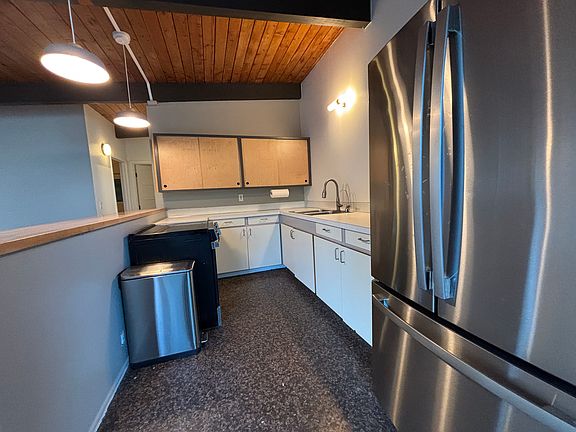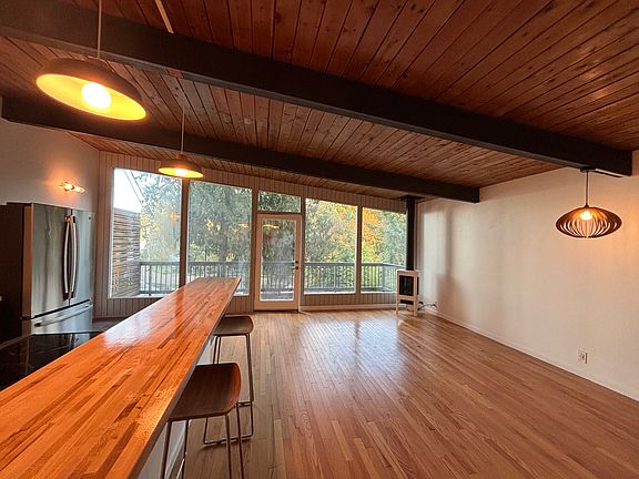 Available now This unique duplex apartment is located in a quiet Westside neighborhood near Evergreen and the Olympia Country Club. It is a one bedroom unit with an office and single-car garage. The midcentury building features hardwood floors, vaulted tongue-and-groove ceilings, and a single-car garage below the living area. Floor to ceiling windows give a sunrise view of Budd Bay and it's common to see deer, eagles, heron, and foxes from the front deck.