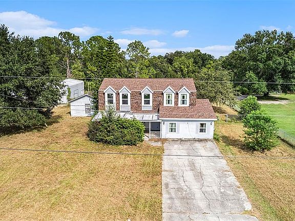 Incredible Opportunity! This property is ready for a makeover to become your dream home or a fantastic investment. The main house offers 4 bedrooms and 2.5 baths with a thoughtfully designed floor plan. Recent updates include a new roof (2022) and new windows. The spacious dining area sits just off the large eat-in kitchen, and the living room provides plenty of space for entertaining or even expanding the kitchen. PLUS a huge family room for all your gatherings. Upstairs, the primary suite features a walk-in closet and ensuite bath with dual sinks, a vanity area, walk-in shower, and tiled soaking tub. Outside, enjoy a covered patio and inground pool—with no backyard neighbors for a picturesque view—perfect for soaking up the Florida lifestyle. Off the pool area is a detached 600 sqft space with private entrance, ideal for a guest suite, in-law suite, home office, or studio. The property also includes a 1,000 sqft commercial garage with oversized doors and its own concrete driveway—great for storage, car enthusiasts, RVs, boats, trailers, or commercial use. The lot backs up to a pond, is zoned for horses, and still keeps you close to all that Wesley Chapel has. No HOA, no CDD! Home is being sold as-is with right to inspect. Well and septic are in good working condition, and the pool is operational—just needs a cleaning.