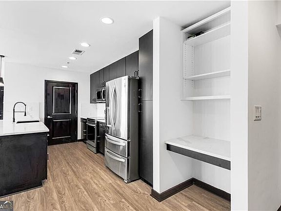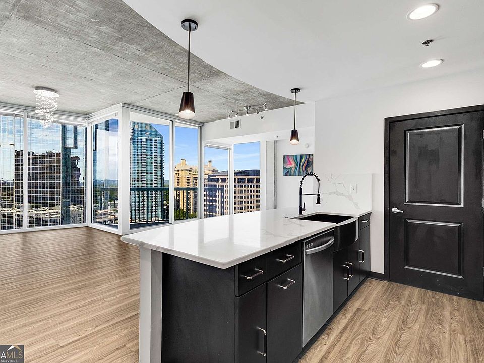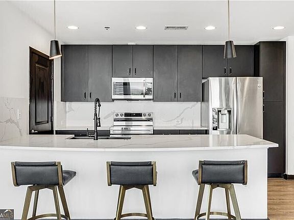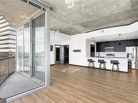 Discover high-rise living in the heart of Buckhead at Realm Residences. This updated 2BR/2BA condominium offers 1,245 sq ft of open living space, 10-ft floor-to-ceiling windows, and panoramic Atlanta city views. The kitchen features quartz countertops, stainless steel appliances, stained cabinetry, a center island, and a built-in desk, flowing seamlessly into the living and dining area with natural light from the surrounding glass walls. The split bedroom layout provides privacy for residents or guests. The primary suite includes a large walk-in closet and a renovated bath with marble shower, black vanity, and quartz counters. The secondary bedroom has access to a fully renovated bath. A private balcony offers both sunrise and sunset views across Buckhead and Midtown. Living in Realm offers residents a uniquely connected Buckhead lifestyle. Morning walks often begin on PATH400, where the city wakes quietly while joggers, commuters, and dog walkers share the path. Weekends bring the convenience of strolling to Lenox Square, Phipps Plaza, or Buckhead Village, home to designer boutiques, local shops, cafes, and popular restaurants. MARTA is moments away for easy access to Midtown, Downtown, and the airport. Everyday routines feel elevated, morning coffee with skyline views, evenings watching the city lights rise, and the ease of having dining, shopping, parks, and entertainment within minutes. Realm's amenities enhance this lifestyle. The lobby level features a clubroom with a 24-hour coffee bar and adjacent meeting rooms. The 8th floor includes a saltwater pool, large sundeck, outdoor dining lounges, grilling stations, fireplaces, and a well-appointed clubroom. A two-level fitness center provides separate spaces for weights, cardio, and yoga. Additional conveniences include a dog park, business center including coffee station, 24-hour concierge, guest suites, and secure access throughout the building. This home includes two assigned parking spaces. HOA dues cover gigabit internet, building insurance, exterior maintenance, and full access to amenities. Realm is an FHA-approved building and is served by top-rated Buckhead public schools: Sarah Smith Elementary, Sutton Middle School, and North Atlanta High School, one of the most sought-after public school clusters in the city