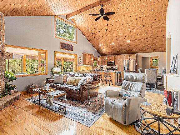 Granite islandTongue and groove ceilingsHickory flooringThree season roomBeautiful viewsStone fireplaceSeparate dining area