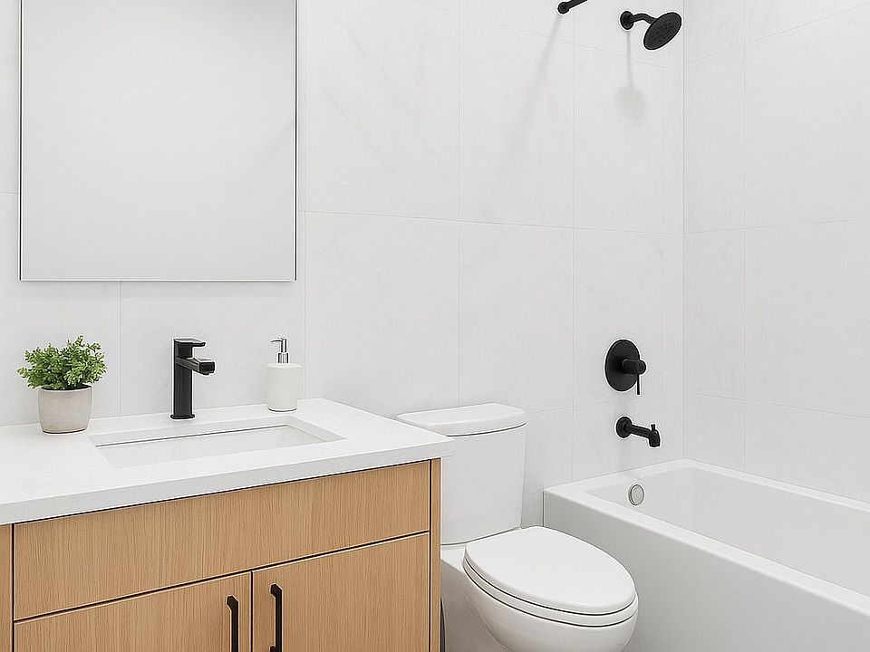 Modern bath with light-veined tile, black accents, and wood-tone vanity