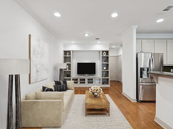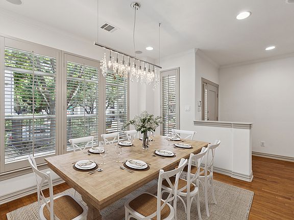 Rare-to-find townhome with front yard patio. Kitchen, dining, living, and powder bath comprise the first level. Utility closet is located on the second floor where two spacious split bedrooms include ensuite baths, large closets and private balconies. High ceilings are on both floors. Wood floors unify the first level. Even a private 2-car garage! Property is gated. Occupants may enjoy the swimming pool located in the center of the grounds. This prime location is near the Katy Trail, Uptown, Turtle Creek and Oak Lawn.