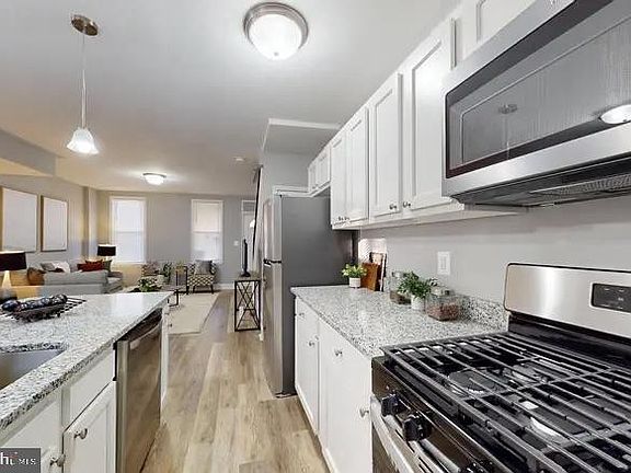 A Stunning Gem in the Four By Four Neighborhood! Step inside this beautifully renovated townhome and fall in love with its modern upgrades and timeless charm. This 2-bedroom, 1-bath home features a brand-new kitchen with granite countertops, stylish cabinetry, and stainless steel appliances — perfect for anyone who loves to cook and entertain. Enjoy sun-drenched rooms filled with natural light, new luxury vinyl plank flooring throughout, and fresh designer paint that gives the home a warm and welcoming feel. Relax on the covered front porch or host summer gatherings on the brand-new rear deck — ideal for outdoor living and entertaining. The unfinished basement offers great potential — whether you use it for extra storage or finish it to add even more living space, the choice is yours! Located just blocks from multiple parks, and only minutes from downtown Baltimore, this home blends comfort, convenience, and community living in one unbeatable package.