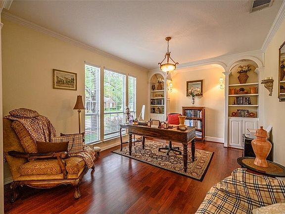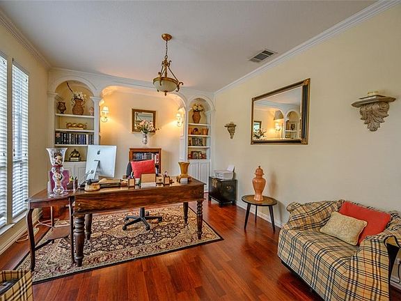 Gorgeous Home in the center of Highlands of Russell Park! Half-block stroll from Hidden Meadow Park! Exceptional Drees built true split floor plan with no adjacent bedrooms! Travertine entry joins gleaming hardwood floors in separate formal study & dining. Welcome to a fantastic 2 story living room with wall of windows and lovely fireplace with custom mantle & built-ins, art ledges & staged crown molding! Lovely master down w bay window, garden tub, sep shower, dual sinks, granite-top vanity. Big open kitchen w granite tops, custom cabinets & trim joins large breakfast room. Game room or upstairs living area splits away each bedroom. Jack-n-Jill full bath on one side and a separate suite has private bathroom!