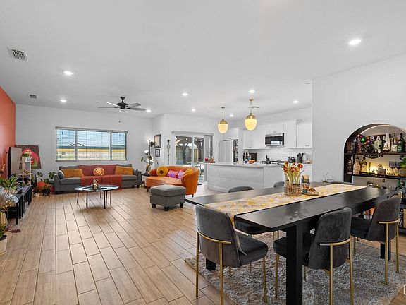 This Gossamer grove stunner is ready for a new owner! Spacious turn-key home w/neutral colors has a calm, light & bright open feel. The chef's kitchen offers white cabinetry, quartz counters, tile backsplash, stainless appliances, golden cabinet knobs, large island w/gold accent pendant lighting. It has tile floors in common areas, carpet in bedrooms. The main bath has a tiled walk-in shower & dual sinks; both baths have white quartz on the vanity. All bedrooms & living room have fans & quality blinds. Off the kitchen, there is a laundry room w/door to the garage wired for electric car charger, has a tankless water heater, the floor has been upgraded w/flake polyaspartic finish & fresh paint. There are 2 sliding doors for outdoor enjoyment. The inviting backyard is ready for entertaining! It comes w/concrete pad areas & sidewalks, turf grass area w/ 2 spacious gazebos. This will steal your heart! This community has lots of walking green areas and parks. Come take a look!