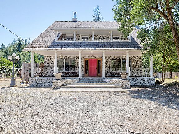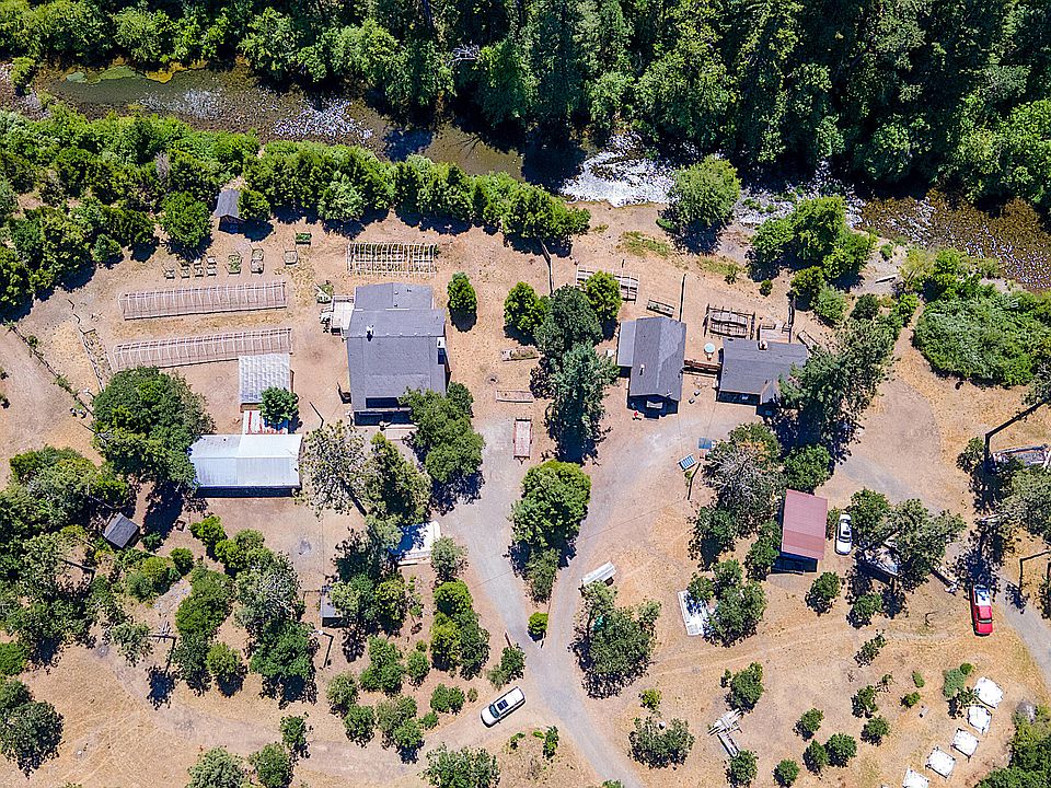 Architecturally unique Craftsman home offers multi-family living along the scenic Illinois River! Spanning 3,084 sq. ft., this home blends timeless character with spacious comfort. It features a grand living room with birds-eye maple beams, a custom redwood bar, and unique tile flooring with warm wood accents. The light-filled expansive kitchen is ideal for cooking, gathering, and entertaining. There's a spacious main floor primary en suite, plus, upstairs you'll find a 2nd primary en suite, 2 additional bedrooms, and a 3rd floor retreat with half bath accessed by a charming spiral staircase — a great spot for work, hobbies, or relaxing. Outside, enjoy a large shop, garden space, and a picturesque pond with irrigation rights from the river. 2 cabins —one 1 bed/1 bath and the other a 2 bed/1 bath offer flexible options for guests or rental income. This extraordinary property is the perfect place to soak up the beauty of the Illinois River, complete with your own private swimming hole!
