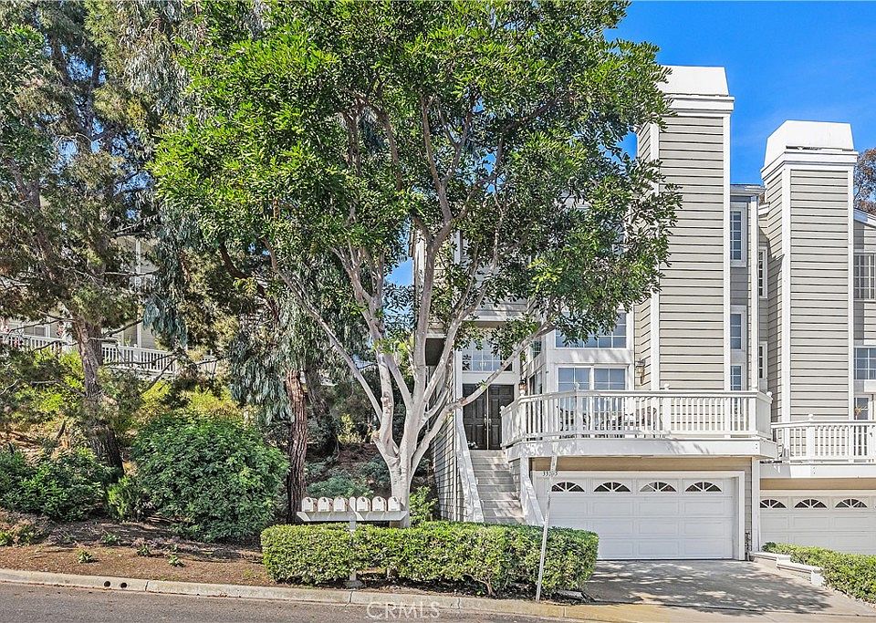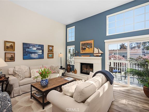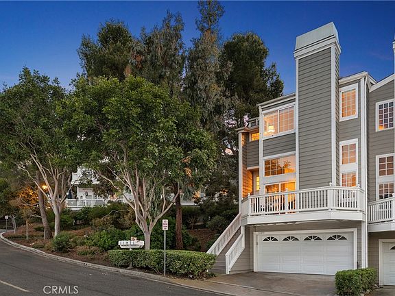 Gorgeous Cape Cod style End Unit Townhome with attached garage just minutes from Dana Point Harbor! Luxurious appointments abound in this 2 bedroom, 2.5 bath home. Enter the living room with dramatic high ceilings, abundant natural light, a cozy fireplace and charming paned windows that overlook a gorgeous open space with mature trees and colorful plants. Sliding doors in the living area open to a romantic and quiet deck for relaxing with a glass of wine and savoring the ocean breezes. Gorgeous luxury vinyl plank flooring throughout the home offers ease of care and warmth. The chef in the family will feel right at home in the remodeled kitchen boasting stunning quartz countertops, designer backsplash, coffered ceiling with recessed lighting and Bosch stainless steel appliances. Step out of your kitchen and onto the private and quiet back patio perfect for barbecuing, dining al fresco, or relaxing with the latest best seller. A combined large pantry and laundry area off the kitchen make laundry day a breeze. A beautiful skylight illuminates the staircase leading to the two ensuite bedrooms upstairs. Retreat to your own private suite complete with a romantic fireplace, walk-in closet, and lovely views of the mountains and trees. The updated primary bath features an open, walk-in shower and gorgeous quartz countertops. A second en-suite bedroom features a lovely bath with quartz countertops and a shower. Completely re-piped and equipped with a new water filtration system, new hot water heater, and new furnace, this home is move-in ready and waiting for you to enjoy! Residents of this gated community enjoy access to resort-style amenities, including a sparkling pool, two spas, and tennis court. The location, just minutes from Dana Point Harbor, boutiques, dining, and world class beaches, offers the best of coastal living. Welcome to your slice of Coastal Heaven.