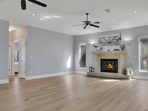 Welcome to this exceptional 3-bedroom, 2.5-bathroom home nestled on 0.85 acres in Cantonment. With a split floor plan, expansive living spaces, and high-end finishes throughout, this home is designed for both comfort and entertainment. You’re greeted by a spacious formal dining area complete with a wet bar, making it the perfect setting for hosting guests. The pass-through to the kitchen enhances flow and functionality. The kitchen itself is a chef’s dream, featuring ample cabinet space, additional built-in storage in the island, stainless steel appliances, a pantry, granite countertops, and a cozy breakfast nook. The living area is warm and inviting, centered around a beautiful focal-point fireplace, creating the perfect gathering space. Natural light floods in through large windows. The primary suite is a true retreat, boasting high ceilings, two walk-in closets, dual vanities, quartz countertops, a luxurious jetted tub, a tiled shower, and a private water closet. From the primary bedroom, step down into the gorgeous sunroom, an ideal place to relax and unwind. This sunroom features a wet bar and can also be accessed directly from the kitchen, offering seamless indoor-outdoor living. On the opposite side of the home, two additional spacious bedrooms share a full bathroom, with an additional half bath conveniently located for guests. The large laundry room provides plenty of space for storage and functionality. Throughout the home, you’ll find no carpet, recessed lighting, and an abundance of natural light, creating a bright and modern atmosphere. Outside, the oversized two-car garage, half-moon driveway, and extra parking make accommodating guests effortless. The back deck leads down into a beautifully landscaped yard adorned with trees, adding to the serene and private setting. A workshop/building in the backyard provides additional storage or workspace. Additional features include a whole-home generator. Schedule your showing today!